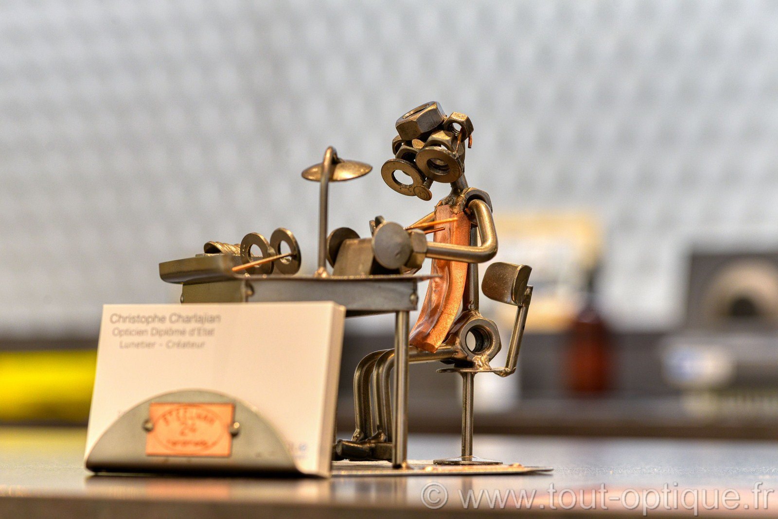 petite sculpture porte-carte, représentant un petit homme fabricant des lunettes. Il est fait de vis, de clous et de boulons, assis sur une chaise